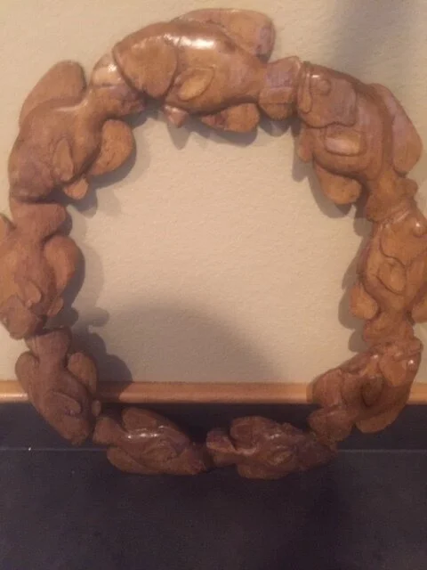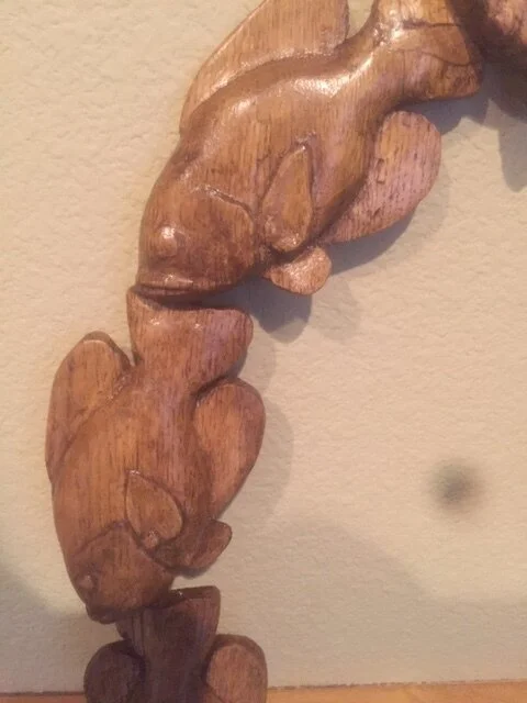 This carving is from cedar. There are Blue Runners or Blue Fish chasing a school of mullet fingerlings. It is 3.5 feet long. I entered this piece in an art show at the college where I was teaching. It was chosen to be the first piece that people would see when they came to the door. A sign by it read “Anyone can be an artist.”